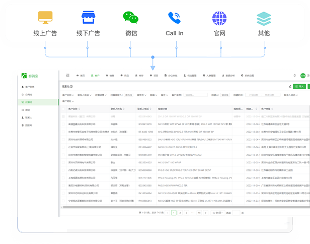 电话进线、异地置换、线下活动、自拓、转介绍等销售线索,可 批量导入或单条录入